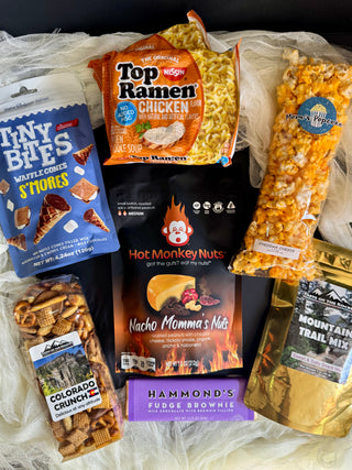 The ultimate snack stash. Whether they’re cramming for finals or hosting a dorm-room movie night, this box is overflowing with Colorado favorites: Trail Mix and Crunch Mix from Taste of the Rockies, Hammond’s chocolate bar, Mom’s Popcorn, waffle cones by Tiny Bites, Hot Monkey Nuts, and of course — ramen noodles (because no care package is complete without it).