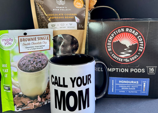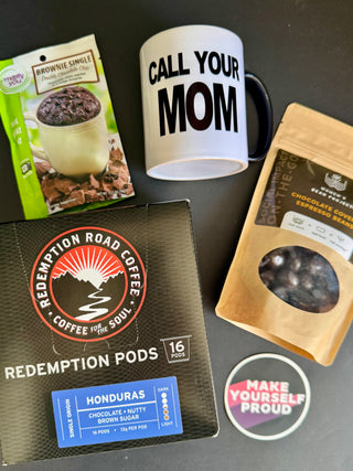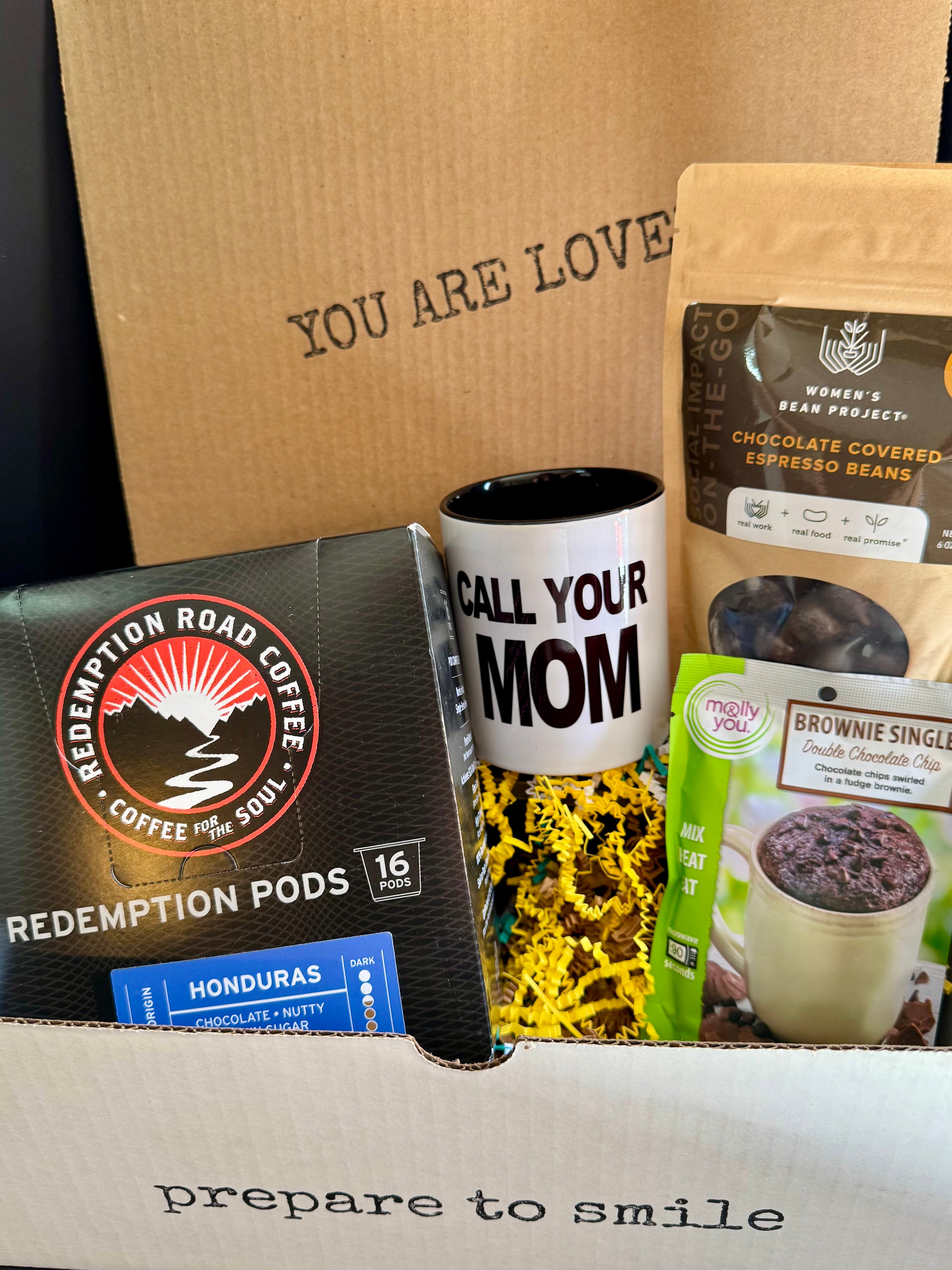 When the late-night study grind kicks in, fuel them up with the All Nighter. Packed with small-batch coffee pods from Redemption Road, chocolate-covered espresso beans made by Woman’s Bean Project, and a Molly & You chocolate mug cake for that midnight sugar rush. To top it off, our custom “Call Your Mom” mug is the perfect reminder to stay connected while powering through the books.